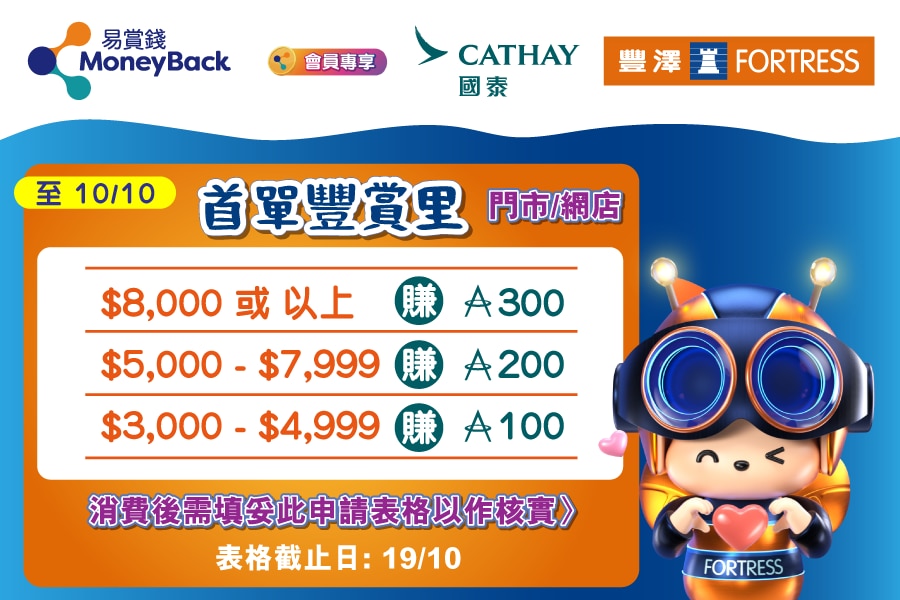 1. 優惠只適用於優惠期期間新登記成為易賞錢會員/ 現有易賞錢會員成為會員後首次於豐澤購物時, 及已將易賞錢會員APP綁定國泰會員賬戶, 並於首單買滿指定金額及於購買後到此網頁 (https://bit.ly/4nBzUle) 提交已綁定之國泰會員賬戶號碼﹑及訂單編號及金額方可享優惠。「亞洲萬里通」里數將於優惠期完結後1個月內直接存入已連結易賞錢的國泰會員賬戶內!每位會員只可享優惠一次, 名額有限,先到先得,額滿即止。 2. 此優惠有效期為2025年9月17日至10月10日。 3. 此優惠優惠只限使用一次。 4. 優惠券只適用於優惠期內之首次豐澤門市/網店購物淨額消費滿$500減$30的訂單使用,分單購物恕不接受。 5. MOP 價錢以 1 港元:1.03 澳門幣之匯率計算,實體店/網店之匯率只供參考,或會因情況而變動。所有網上商店/ 實體店產品價格及優惠均以網站顯示之價錢為準。 6. 須出示易賞錢手機App方可享有優惠。 7. 此優惠只適用於任何香港及澳門豐澤門市及網店。 8. 此優惠不適用於購買禮券/現金券、電話上台服務、任何儲值卡、繳費賬項、八達通增值、塑膠購物袋收費、蘋果維修服務。此優惠亦不可與其他優惠同時使用。 9. 如有任何爭議,豐澤保留最後決定權。